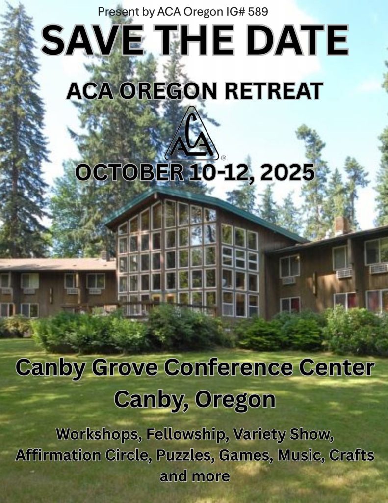 Join us for the 2025 ACA Oregon Retreat on the weekend of October 10 – 12, 2025 at Canby Grove Conference Center.