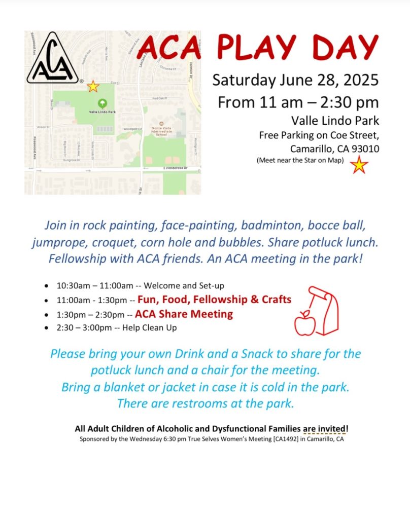 Join in rock painting, face-painting, badminton, bocce ball, jumprope, croquet, corn hole and bubbles. Share potluck lunch. Fellowship with ACA friends. An ACA meeting in the park!