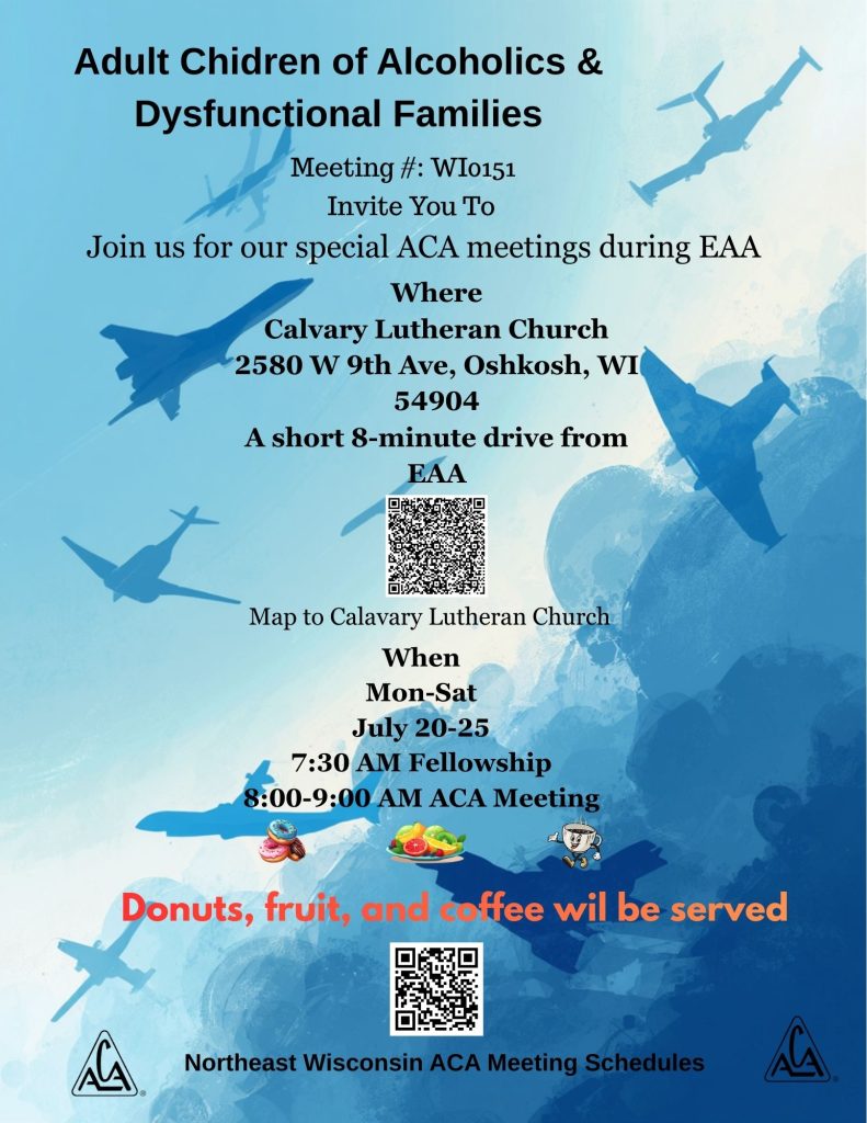 In celebration of AirVenture week, our local Adult Children of Alcoholics groups, WI0151, will be hosting special ACA meetings at 8:00 AM each morning, Monday, July 20 through Saturday, July 25.