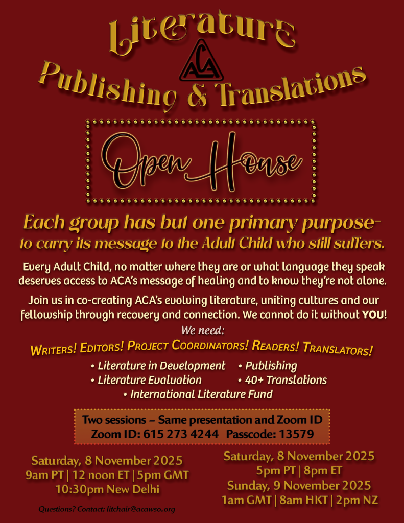 Every Adult Child deserves to hear the ACA message of healing and know they are not alone. Literature is how we carry this message to those who still suffer, and your participation is essential.